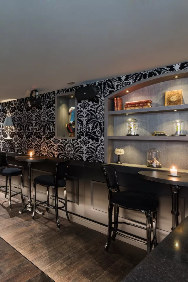 Le choix des objets surréels apporte l’esprit excentrique des collectionneurs anglais et ses cabinets de curiosités. Les tonalités foncées des meubles et murs harmonisent les objets de différentes couleurs et formes. Certains éléments de mobilier ont été dénichés chez des antiquaires et rénovés. Les tableaux accentuent l’idée de dynastie avec humour.