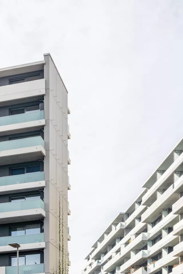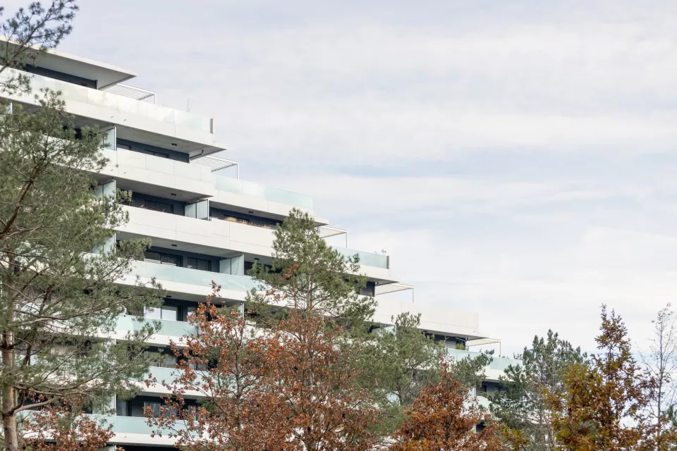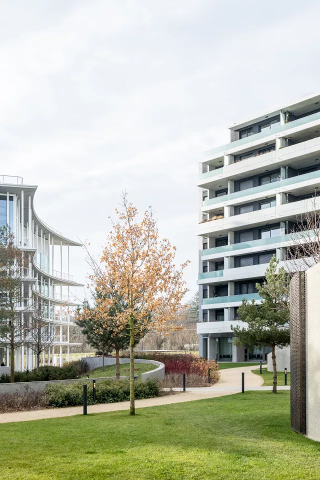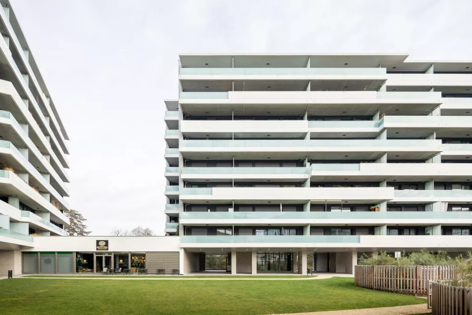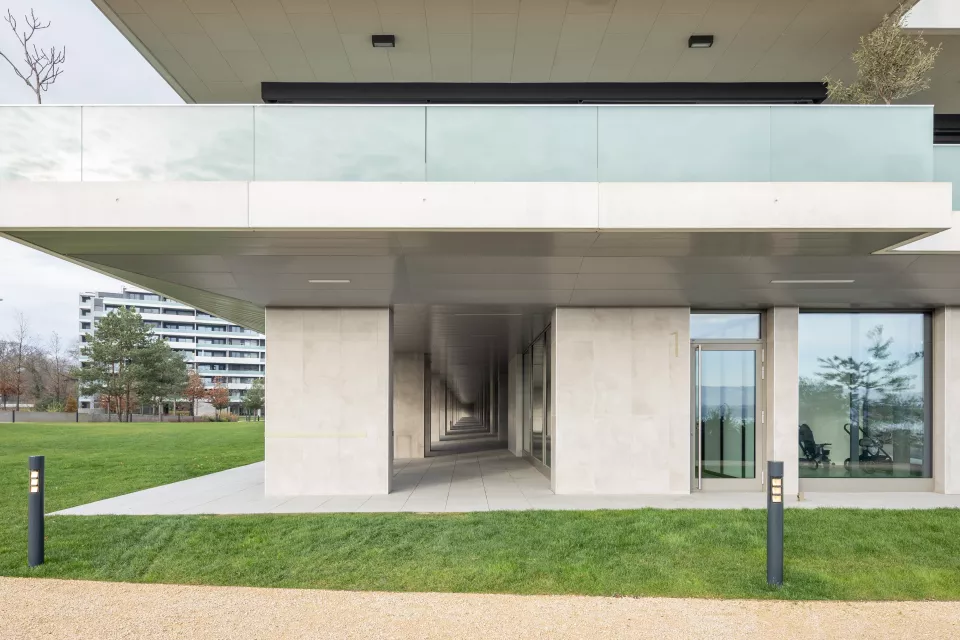 Les façades largement vitrées, soulignées de bacs à plantes, allègent le programme et donnent à l’ensemble une expression vivante. Dans cette logique d’ouverture sur les quatre orientations, le projet intègre des espaces extérieurs privés : des balcons de dimensions variées qui prolongent le paysage, enrichissent la vie des usagers et inscrivent la nature au cœur de l’architecture.