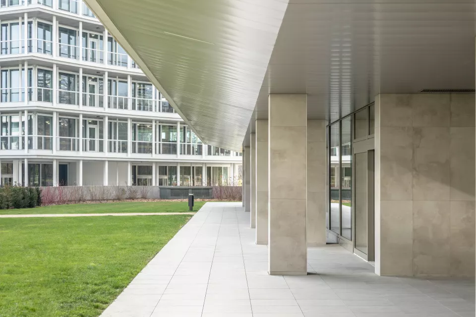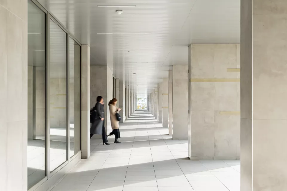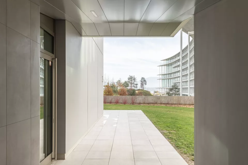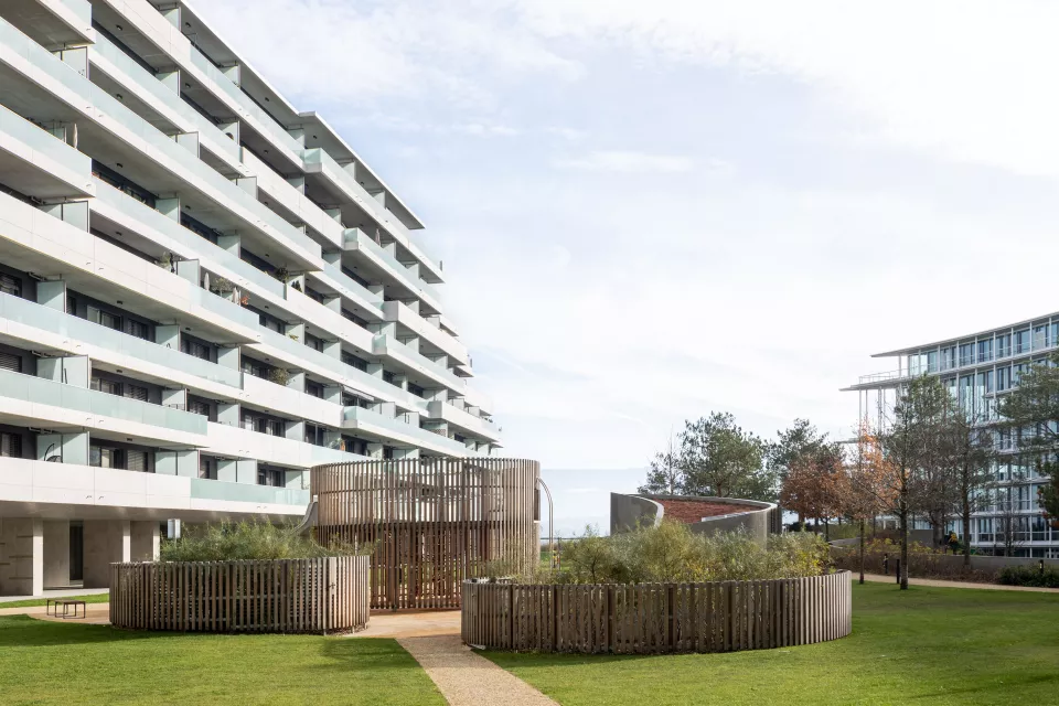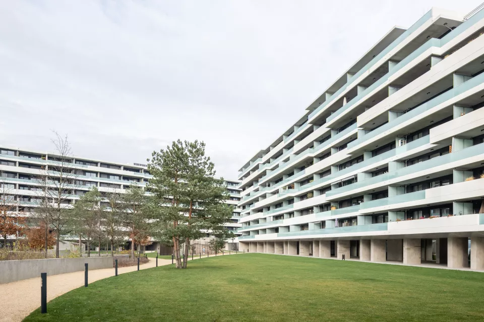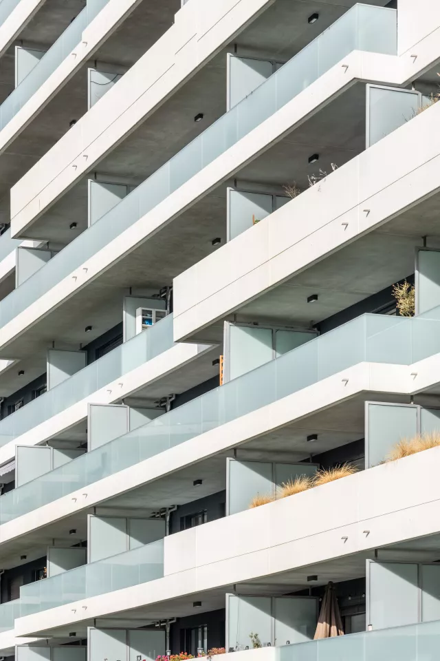 Les façades largement vitrées, soulignées de bacs à plantes, allègent le programme et donnent à l’ensemble une expression vivante. Dans cette logique d’ouverture sur les quatre orientations, le projet intègre des espaces extérieurs privés : des balcons de dimensions variées qui prolongent le paysage, enrichissent la vie des usagers et inscrivent la nature au cœur de l’architecture.