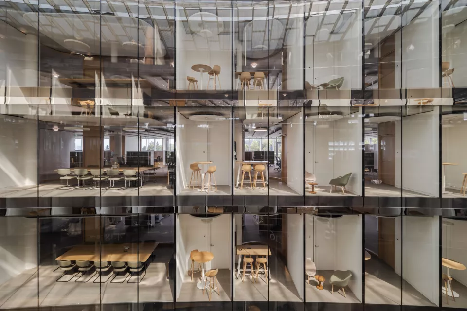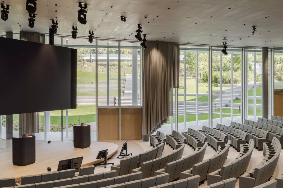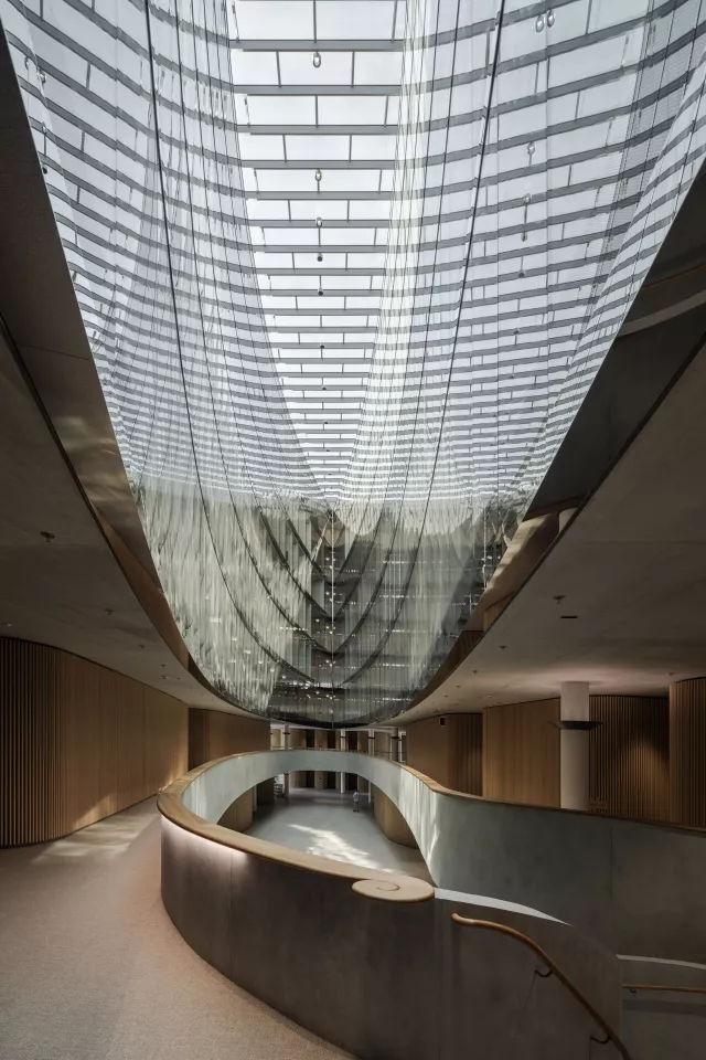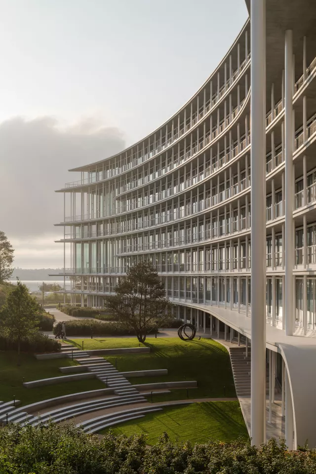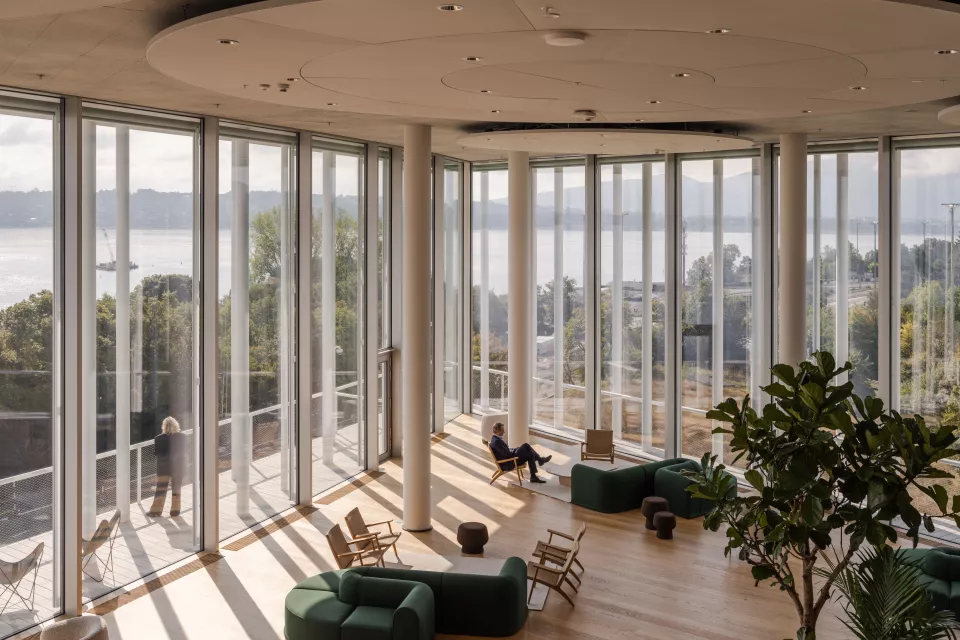 Le nouveau siège de la banque Lombard Odier, implanté à Bellevue en bordure du Léman, s’inscrit avec sobriété dans son environnement paysager. Conçu pour accueillir 2 600 collaborateurs, il affirme une vision unitaire fondée sur les valeurs d’excellence, d’innovation et de durabilité.