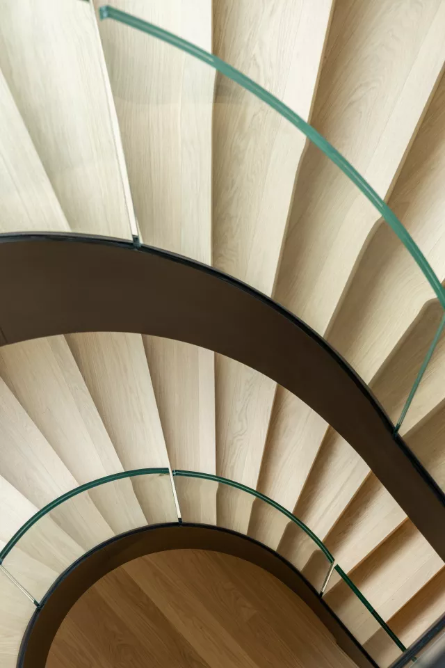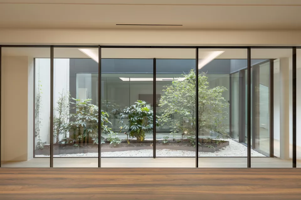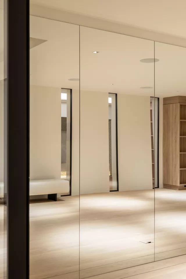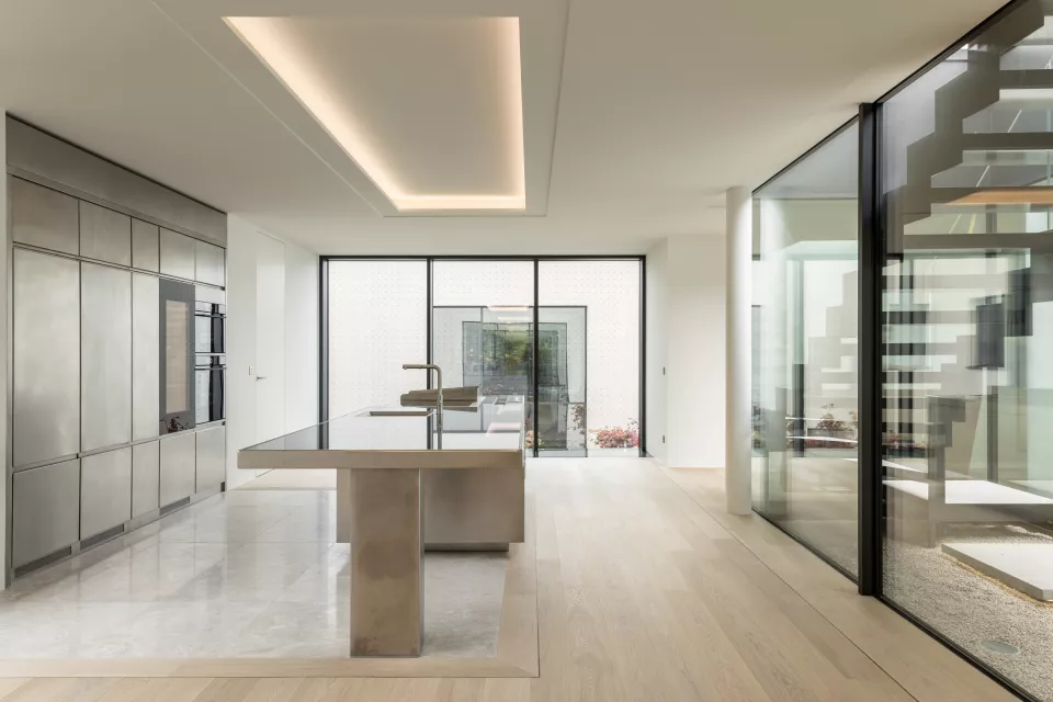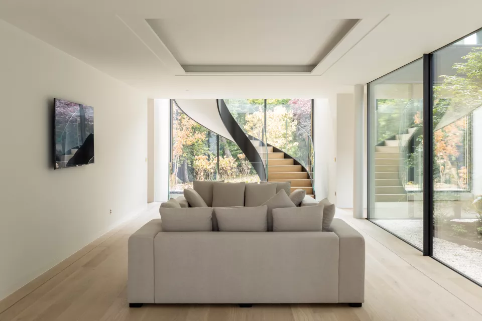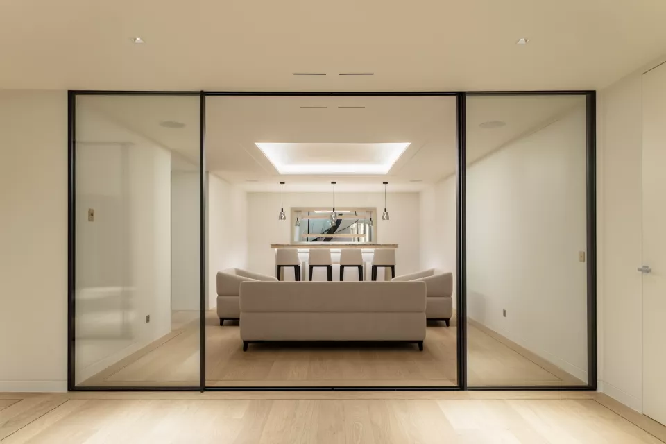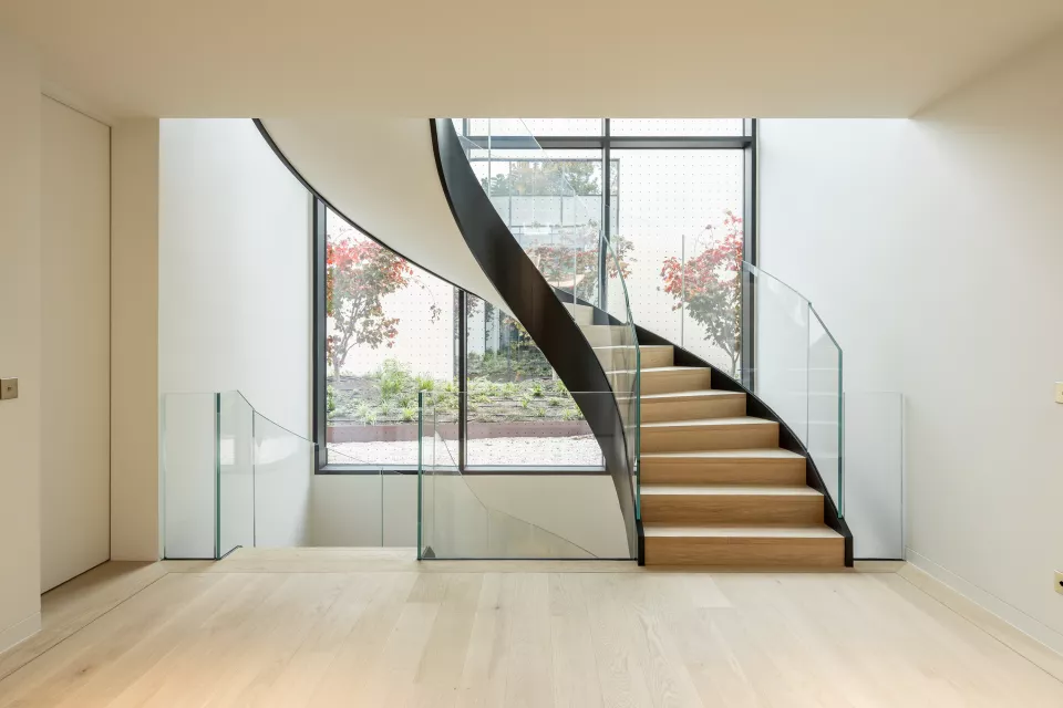 La première villa s’ouvre sur une entrée accueillant un bureau-studio indépendant. Un mur et un patio d’inspiration japonaise structurent l’espace entre les deux villas et apportent de la lumière jusqu’à la cave à vins. Depuis l’entrée, une circulation horizontale mène au cellier-cuisine, à l’ascenseur, au bloc sanitaire et à un patio traversant les deux niveaux, révélant le piano nobile articulé majoritairement en plan libre et ouvert.