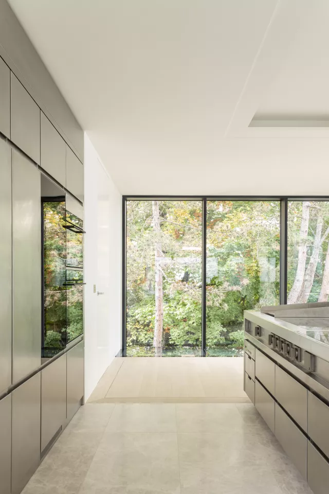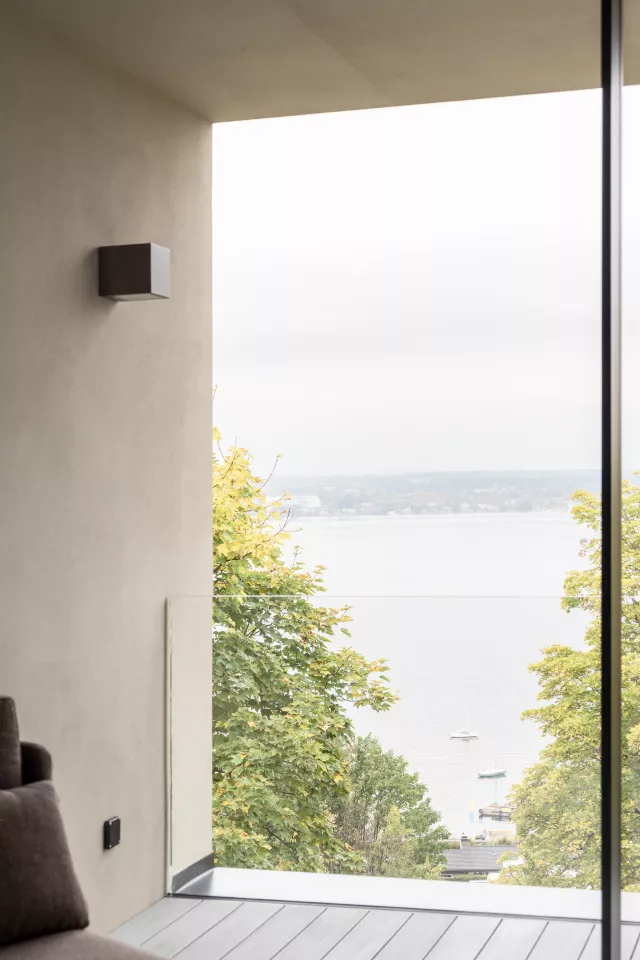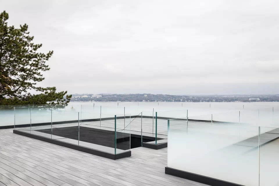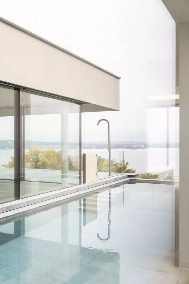 Face au lac, un espace de vie de 55 m² s’étend sur toute la façade et se prolonge par une large terrasse. À l’étage inférieur se trouvent trois chambres et une suite parentale avec double dressing et salle d’eau complète. Le sous-sol accueille un espace de loisirs comprenant salle de cinéma, fitness, zone bien-être avec bassin intérieur, jacuzzi, hammam et sauna, ainsi que les locaux techniques et un abri antiatomique.